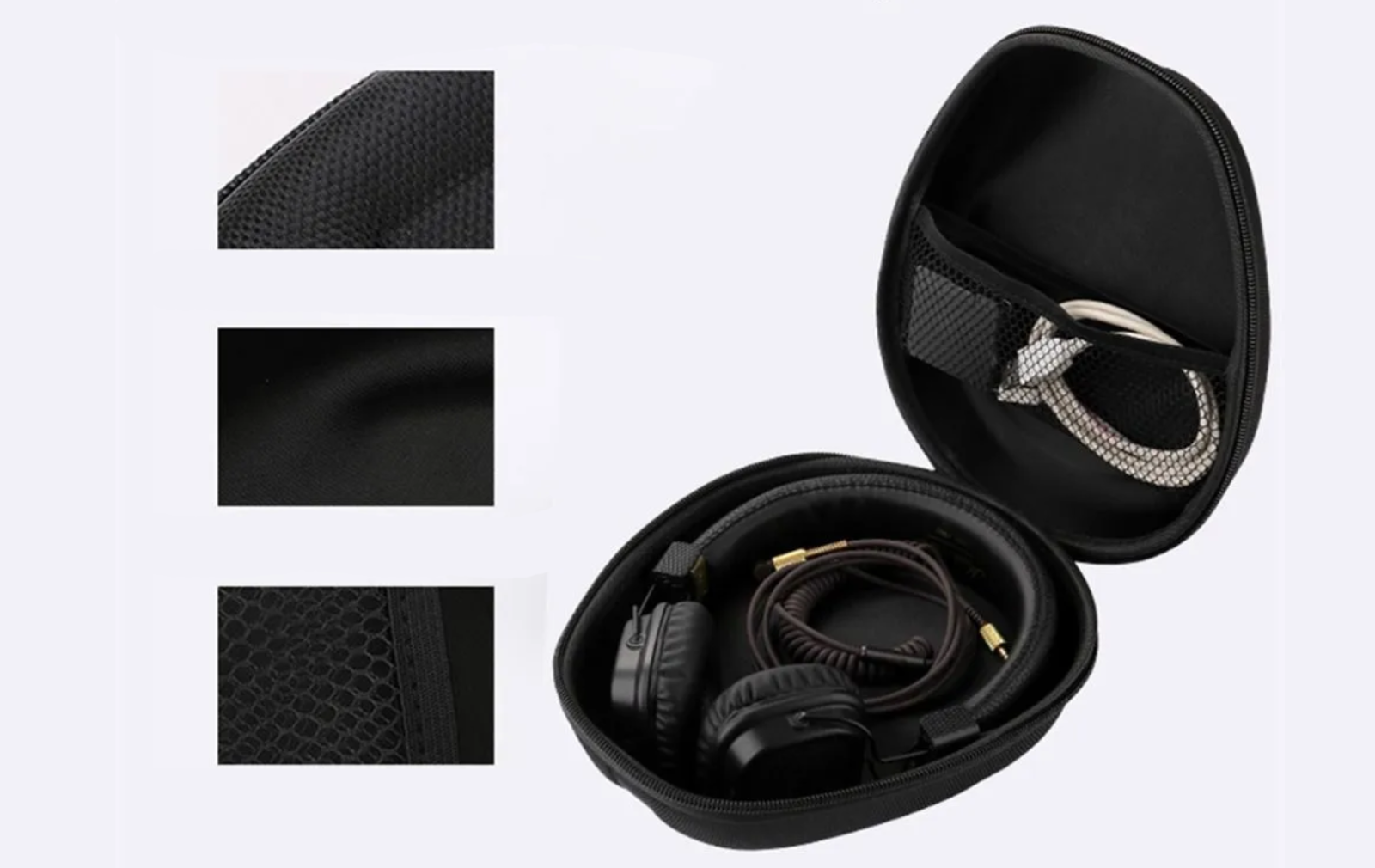 O compartimento embutido reduz o desgaste na superfície do fone de ouvido e o pano é forte e resistente ao desgaste.